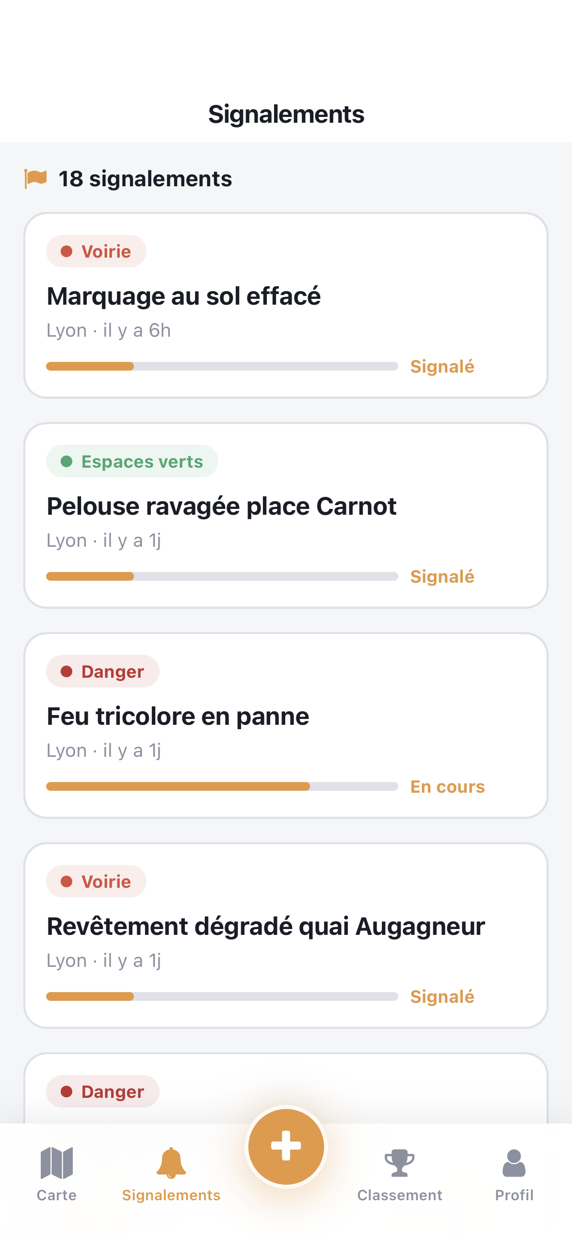 Chaque signalement passe par 4 étapes : signalé, pris en compte, en cours, résolu. Tu vois tout ce qui se passe dans ta commune.